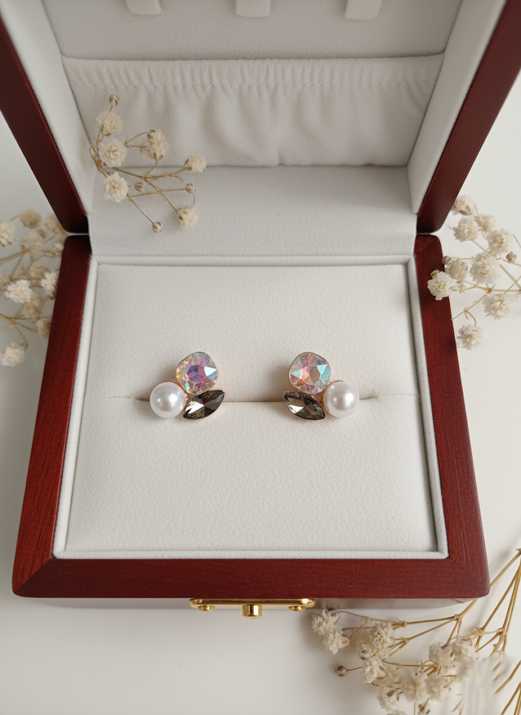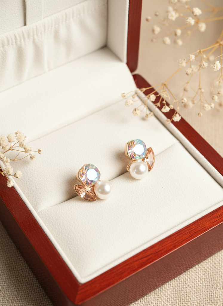 These are sophisticated and elegant cluster stud earrings that combine sparkle and classic refinement. The design features a delicate arrangement of elements, centered around a prominent, brilliant-cut Aurora Borealis (AB) finish crystal that reflects multiple iridescent colors. Flanking this central stone are a warm, champagne or rose-gold colored marquise-cut crystal and a smooth, lustrous faux pearl. The combination of the multi-faceted stones and the soft pearl creates a stylish, textured, and feminine look, making them ideal for weddings, formal events, or adding a touch of glamour to everyday wear.