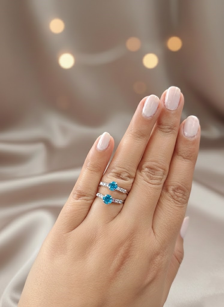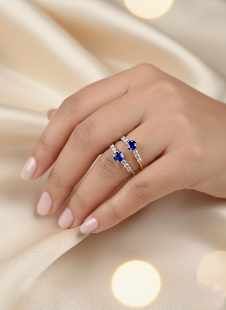 Elegant and modern, the Celestial Embrace Ring features a striking bypass design that wraps gracefully around the finger. It showcases two brilliant, deep blue sapphire , Ruby, Sky Blue, Green, Mauve, Black gemstones, each complemented by a dazzling line of crystal clear diamond accents. The contrasting gold and white gold tones of the setting add depth and sophistication, creating a piece that symbolizes connection and eternal flow. This ring is a luxurious statement, perfect for an anniversary, a special milestone, or as an elevated everyday accessory.
