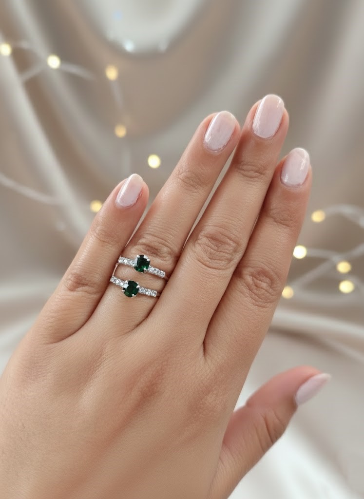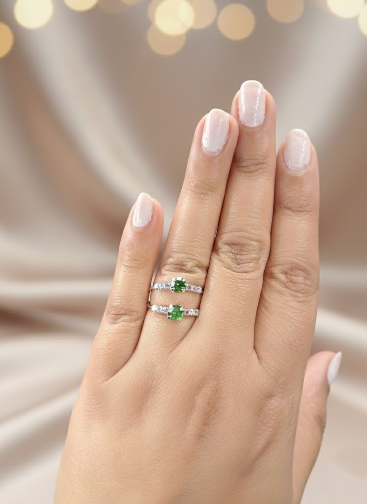 Vibrant Emerald Cut Stones: Each ring highlights a square or cushion-cut gemstone in a rich, captivating emerald green, Deep blue sapphire , Ruby, Sky Blue, Mauve, Black.