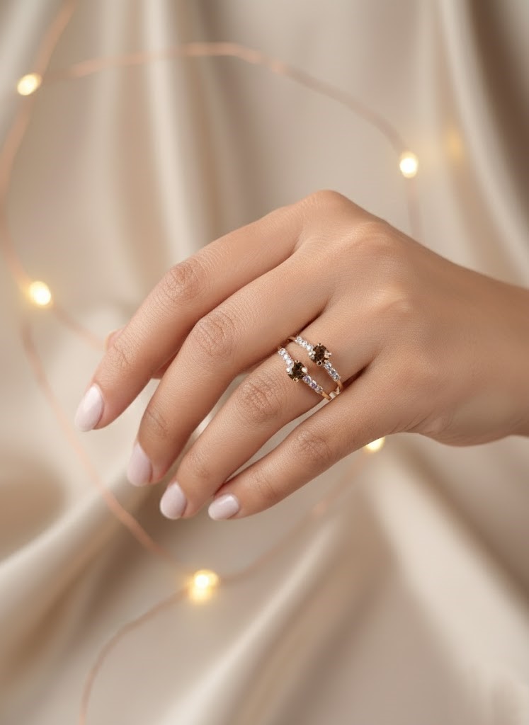 Pink/White Gem Accents: The top ring features small pink or white side stones, adding subtle brilliance and texture to the stack.