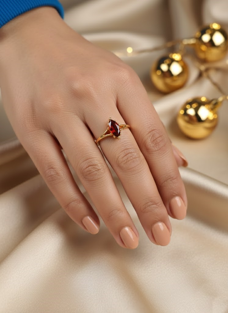 This striking solitaire ring showcases a deep, fiery red, marquise-cut and Garnet Oval-cut gemstone (likely a Garnet or Ruby) set in a polished yellow gold band. The stone is positioned horizontally, and the pointed ends are securely held by prongs that blend into the split-shank design of the band. The marquise cut’s elongated shape is known for making the finger appear longer and more slender. The vibrant red stone contrasted with the warm gold makes this piece an eye-catching statement accessory.