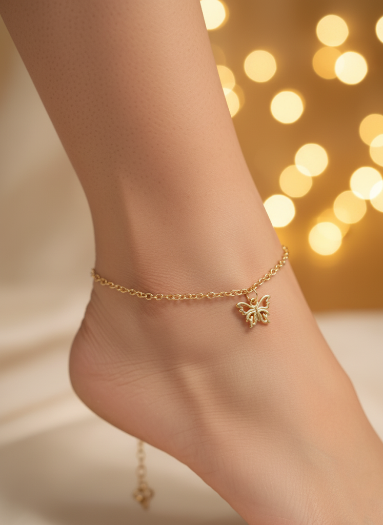 This exquisite anklet embodies feminine grace and simple elegance. It features a delicate, fine-link gold-tone chain that wraps lightly around the ankle. The sole adornment is a beautifully detailed butterfly charm, crafted in the same warm gold-tone, which dangles gently as you move. This minimalist design allows the charm to be the focal point, symbolizing transformation and beauty. The anklet is photographed against a soft, glowing, bokeh-lit background, highlighting its subtle glamour, making it a perfect dainty accessory for any occasion.