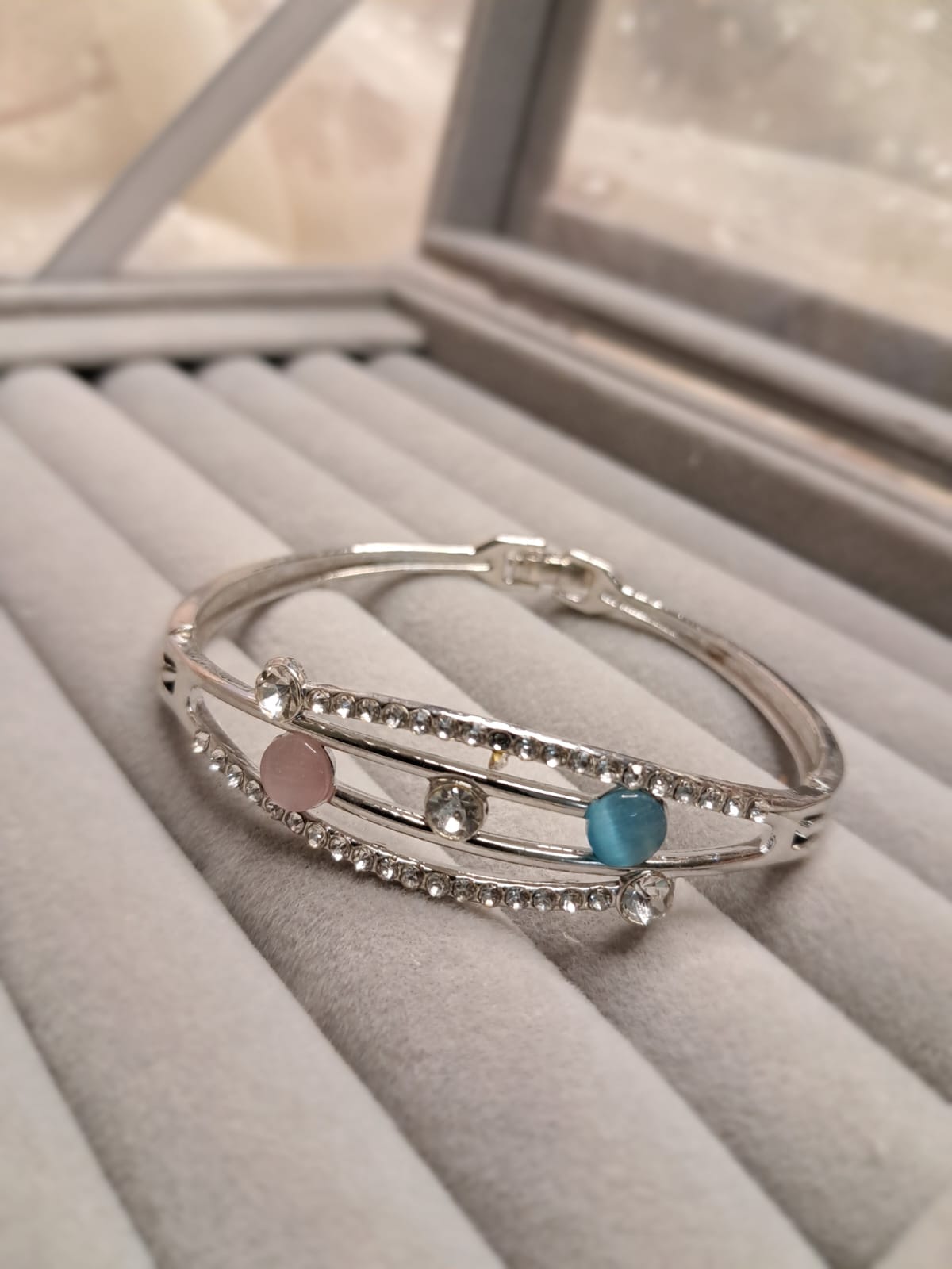 This bold, modern bangle features a symmetrical and layered design, making it a powerful statement piece. The centerpiece is constructed with three parallel bands of silver-tone metal. The two outer bands are fully paved with clear, sparkling crystals. The central bar is smooth and acts as a setting for two small, smooth, round cabochon stones in contrasting peachy-pink and seafoam green/teal colors. Additional clear crystal accents sit on the ends, bridging the three bands. This rigid, hinged bangle offers a wide, textured, and sophisticated look that is both geometric and glamorous.
