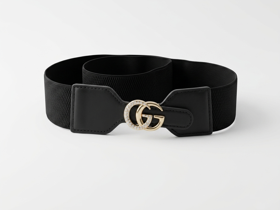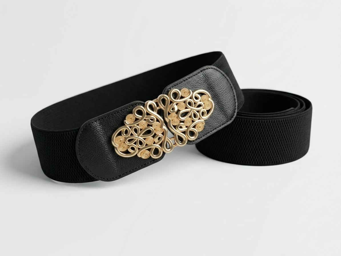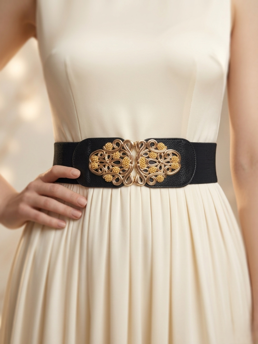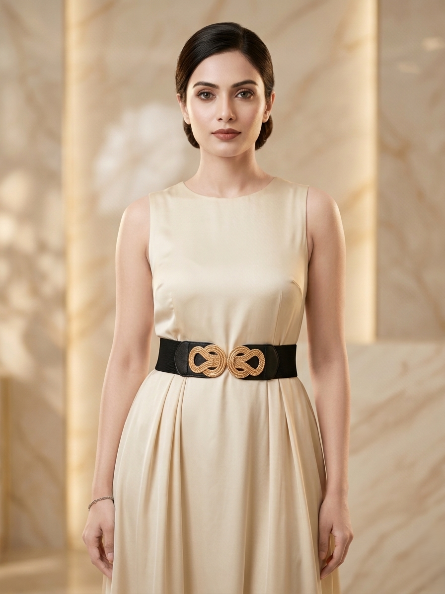 Designed to be the crowning jewel of your ensemble, this belt features a bespoke, hand-finished interlocking buckle with a high-luster gold plating. The sculptural design is meticulously engineered to serve as a focal point, catching light from every angle. Set on a premium, dense-weave black elastic band, it provides a flawless, body-sculpting fit that transitions effortlessly from a power blazer at a corporate event to a flowing silk sari for an evening gala. It is not just an accessory; it is a piece of wearable art.