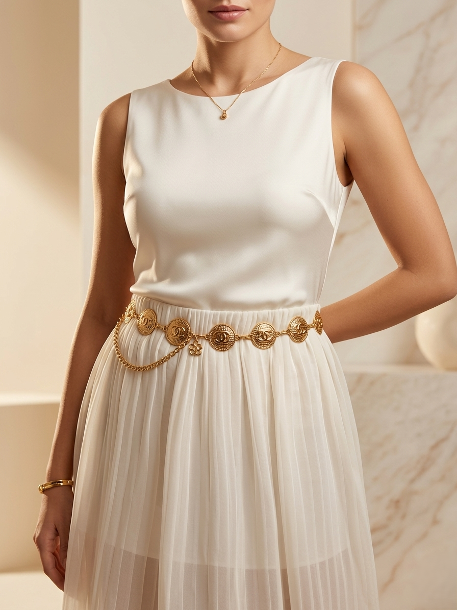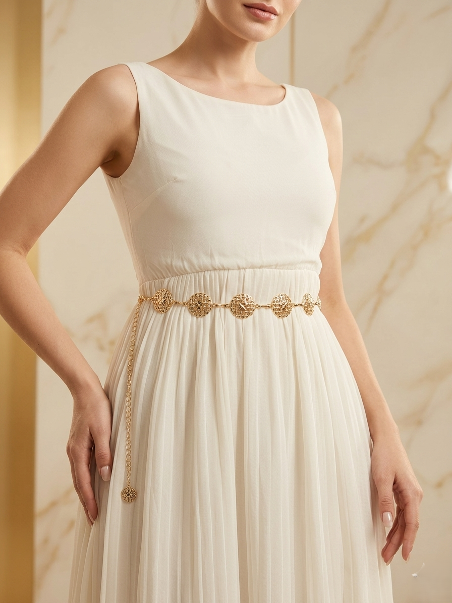 Artisanal Interlock Buckle: A high-shine, tarnish-resistant gold-tone centerpiece featuring intricate filigree-style detailing for a regal look.