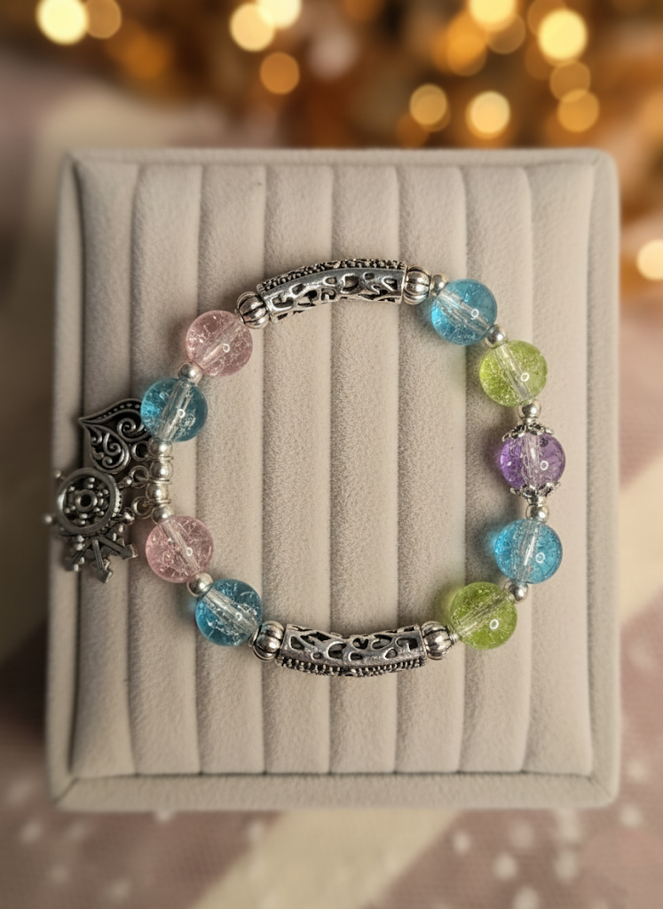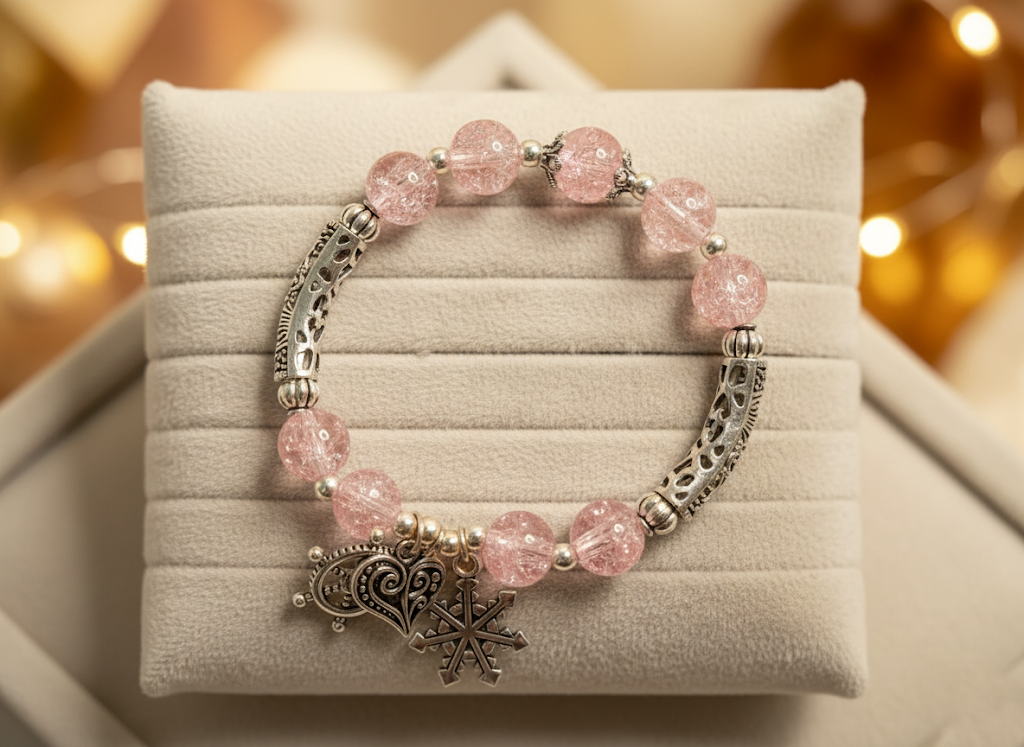 This beautiful beaded bracelet features a vibrant, feminine design perfect for adding a touch of sparkle to your wrist. It is composed of large, round pink crackled glass beads that catch the light, interspersed with elaborate silver-tone metal scrollwork tubes. A delicate dangle charm features a stylized heart and an intricate snowflake, giving the piece a cozy, elegant, and romantic winter theme. This stretch bracelet is easy to wear and comfortable, making it a lovely gift or a festive treat for yourself.