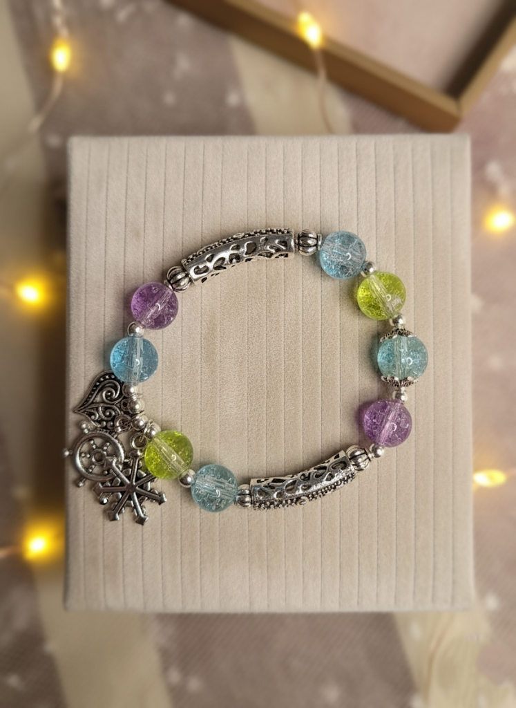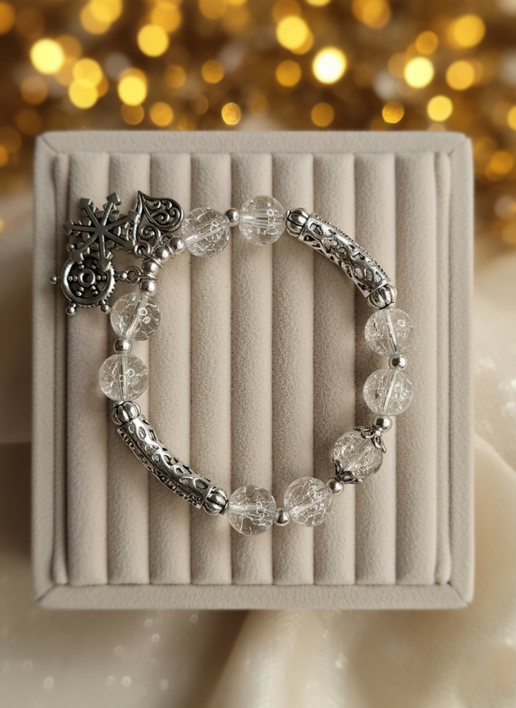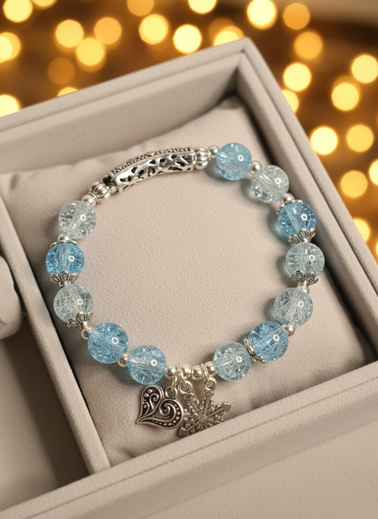 - Themed Charm Dangle: Adorned with a dangling charm cluster that includes a heart and a snowflake, suggesting themes of romance and winter elegance.
