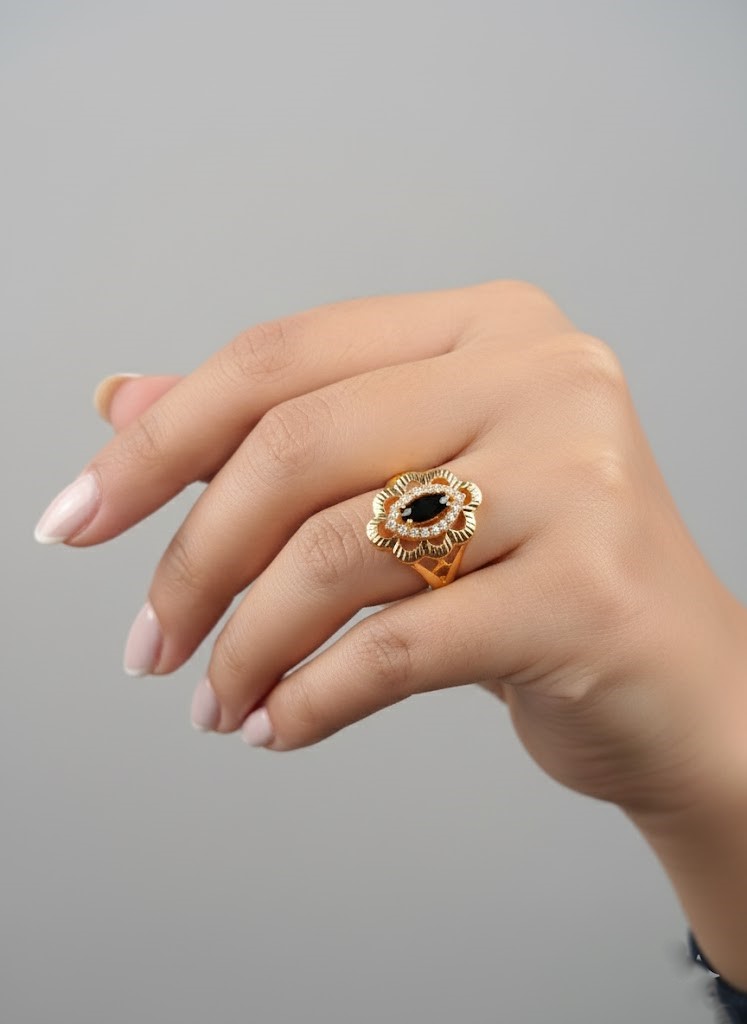 Step into an aura of sophisticated mystery with the “Regal Onyx Bloom” ring. This captivating piece features a striking marquise-cut black onyx gemstone at its heart, exuding a deep, polished allure. The rich darkness of the onyx is beautifully contrasted and enhanced by a dazzling halo of brilliant white accent stones, creating a captivating sparkle. This elegant centerpiece is nestled within an ornate gold setting, meticulously crafted to resemble delicate petals or an intricate floral wreath. The textured gold work adds a luxurious dimension, making this ring a perfect blend of vintage charm and contemporary elegance. Ideal for those who appreciate bold beauty and classic style, the Regal Onyx Bloom is a statement piece that promises to elevate any look.