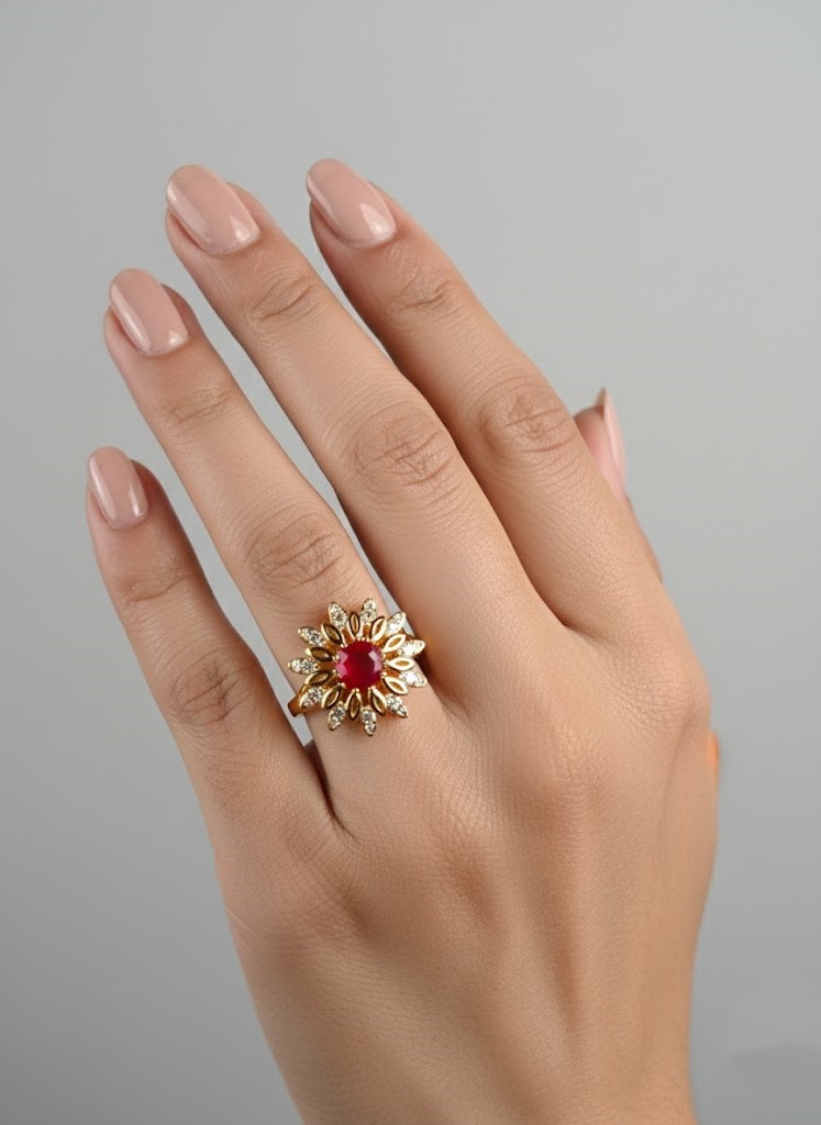 Premium Gold Setting: Crafted from lustrous gold, providing a rich backdrop that enhances the vibrant color of the ruby and the sparkle of the accent stones.
