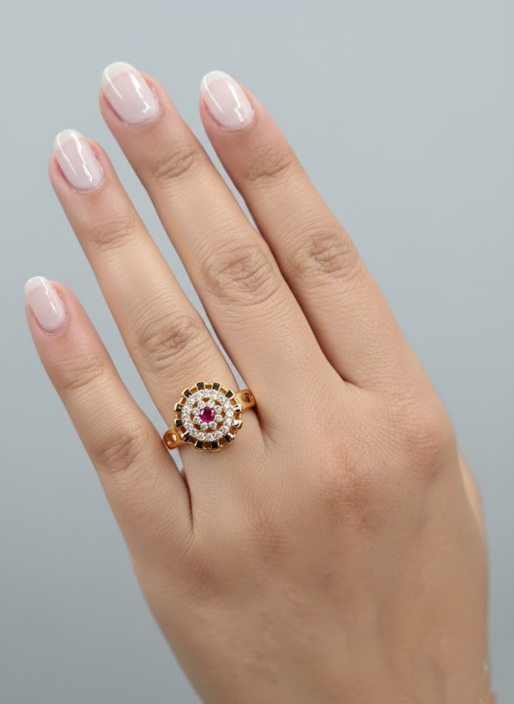 Ascend to new heights of elegance with the “Ruby Zenith Bloom” ring, a truly captivating piece designed to mesmerize. At its core, a vibrant, rich ruby commands attention, its deep crimson hue a symbol of passion and vitality. This stunning central gemstone is surrounded by a dazzling halo of brilliant white accent stones, creating an exquisite focal point. The ring’s unique design features multiple tiers of golden embellishments, intricately crafted with textured details that radiate outwards, giving the impression of a sophisticated bloom or a celestial body. This harmonious blend of striking color, brilliant sparkle, and detailed gold work results in a ring that is both luxurious and timeless, perfect for celebrating significant moments or adding a touch of regal splendor to any ensemble.