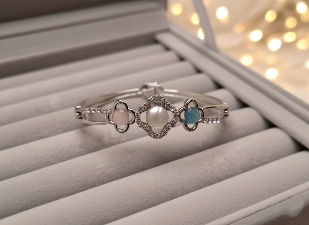 - Silver-Tone Bangle: The bracelet is made with a polished silver-tone metal and a rigid, hinged structure, ensuring a secure and elegant fit.
