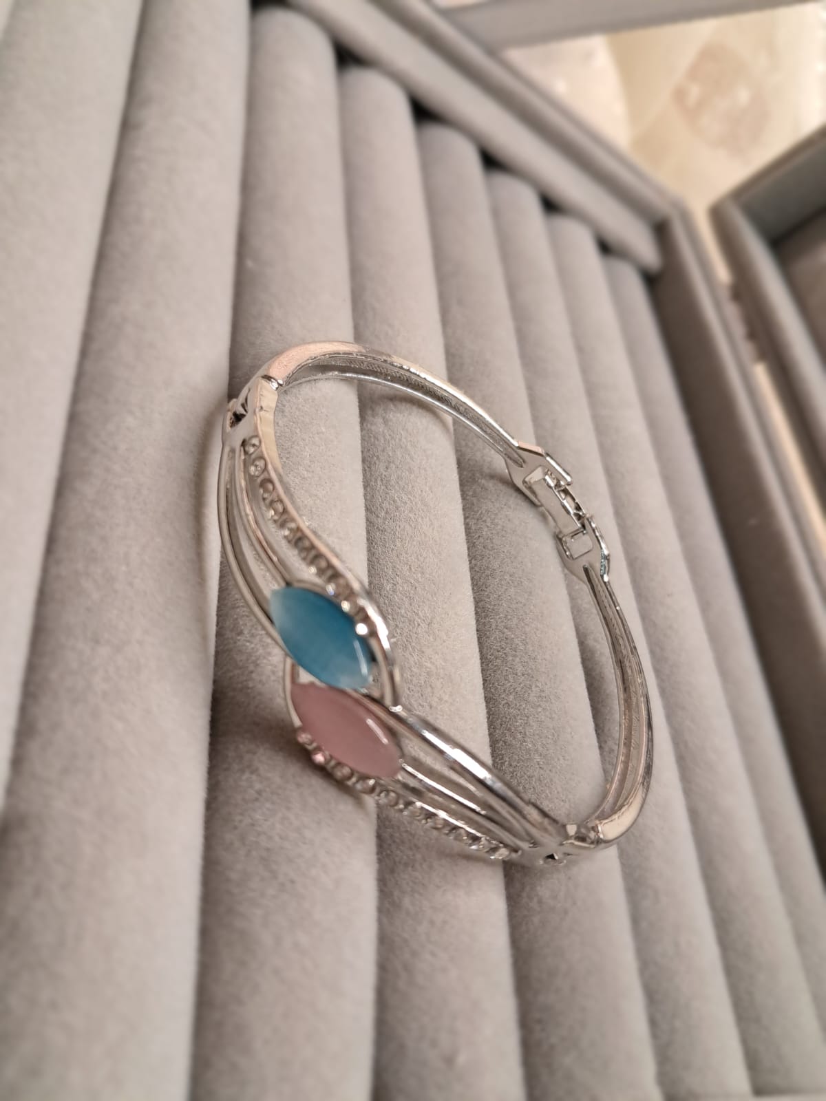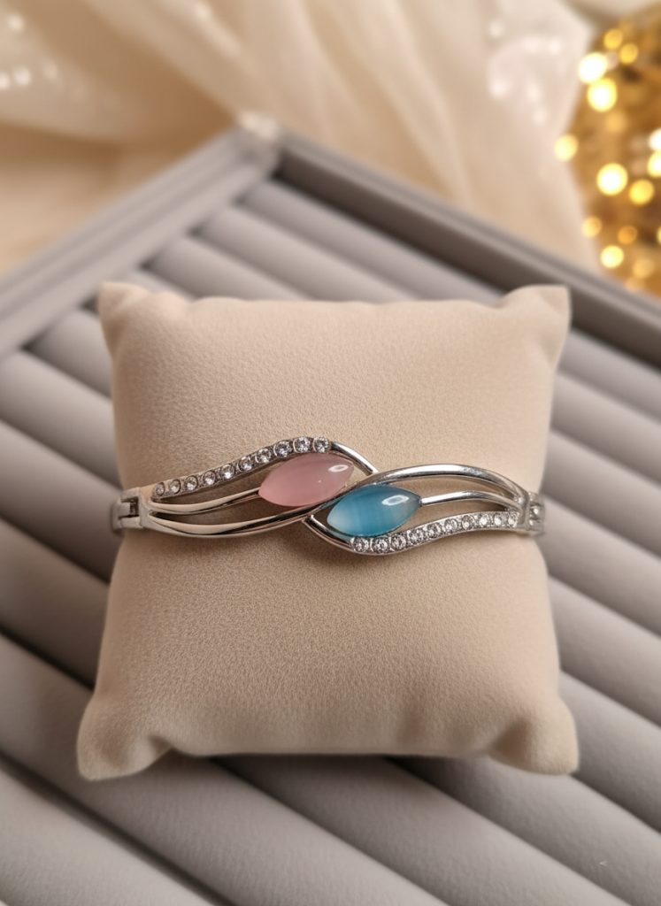 This sophisticated bangle features a striking, modern design with a central crossover motif. The polished silver-tone metal forms elegant, intertwined bands at the top, which frame two beautifully smooth, oval-shaped cabochon stones. One stone is a soft peachy-pink hue, and the other is a luminous aqua/teal cat’s eye stone, providing a lovely contrast in color and finish. The curves of the bands are further enhanced by segments of sparkling clear crystals, adding a touch of brilliant glamour. As a hinged bangle, it secures comfortably around the wrist, making it a bold yet feminine statement accessory.