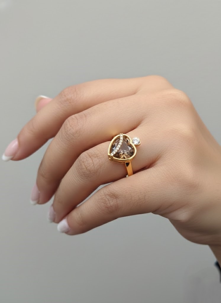 Declare your affection with the captivating “Smoky Heart Embrace” ring, a piece that blends romantic symbolism with sophisticated allure. At its heart lies a striking, generously sized smoky quartz gemstone, meticulously cut into a perfect heart shape. Its rich, translucent brown hue offers a deep, enigmatic beauty. This central gem is beautifully embraced by a shimmering curve of brilliant white accent stones, adding a delicate sparkle that contrasts elegantly with the smoky depth of the main stone. A single, luminous round accent stone crowns the top, adding a final touch of brilliance. Set in lustrous gold, this ring is a unique and elegant statement, perfect for expressing heartfelt emotions or adding a touch of distinctive charm to any ensemble.