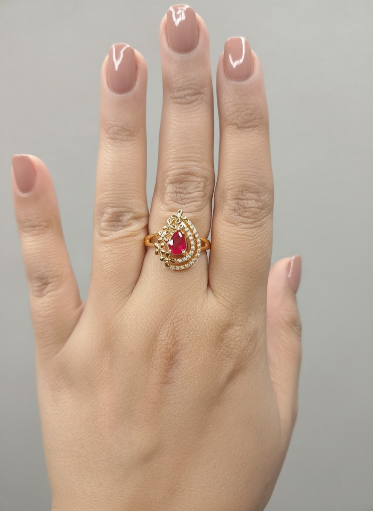 Captivate with the exquisite elegance of the Blossom Tear Ruby Ring. This stunning gold ring features a brilliant pear-shaped ruby (or deep pink gemstone) as its vibrant and alluring centerpiece, radiating passionate color. The striking teardrop gem is artfully complemented by a cascade of delicate gold floral motifs on one side and a sweeping curve of sparkling white cubic zirconia stones on the other. The lustrous gold setting beautifully enhances the gem’s warmth and the surrounding sparkle. This ring is a harmonious blend of nature-inspired artistry and luxurious glamour, perfect for those who desire a unique statement piece that embodies romance and sophisticated design.