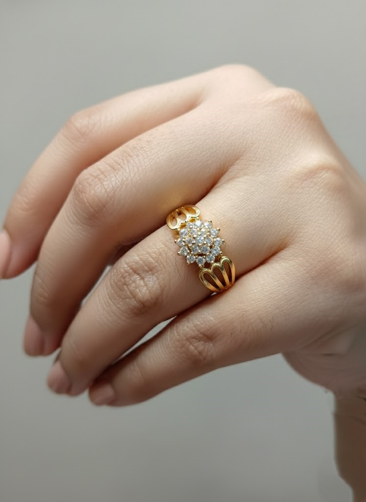 Adorn your hand with the captivating beauty of the Blossoming Radiance Ring. This exquisite piece features a central cluster of brilliant diamonds, meticulously arranged to resemble a dazzling flower in full bloom, capturing light from every angle. Flanking this radiant centerpiece are elegant gold shoulders, intricately designed with flowing, petal-like curves that enhance the floral theme. Crafted from lustrous gold, this ring blends delicate artistry with stunning sparkle, making it a perfect symbol of beauty, growth, and everlasting shine. It’s an ideal choice for adding a touch of sophisticated glamour to any ensemble.
