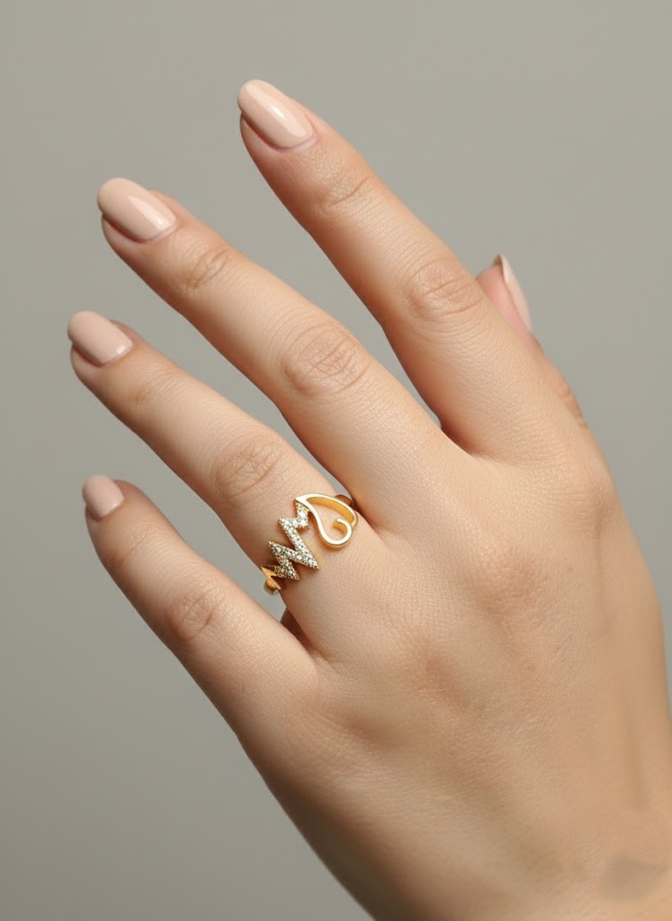 Keep love close to your heart with the captivating Heartbeat Sparkle Ring. This unique piece elegantly merges two powerful symbols: a graceful heart and a dynamic “M” shape, intricately adorned with shimmering diamonds, all crafted in radiant gold. The design evokes the rhythm of a heartbeat, symbolizing vitality, affection, and a personal connection. Its modern yet meaningful aesthetic makes it a distinctive accessory perfect for celebrating a loved one whose name starts with ‘M’ or simply expressing your vibrant spirit. This ring is a stylish testament to enduring love and personal flair.