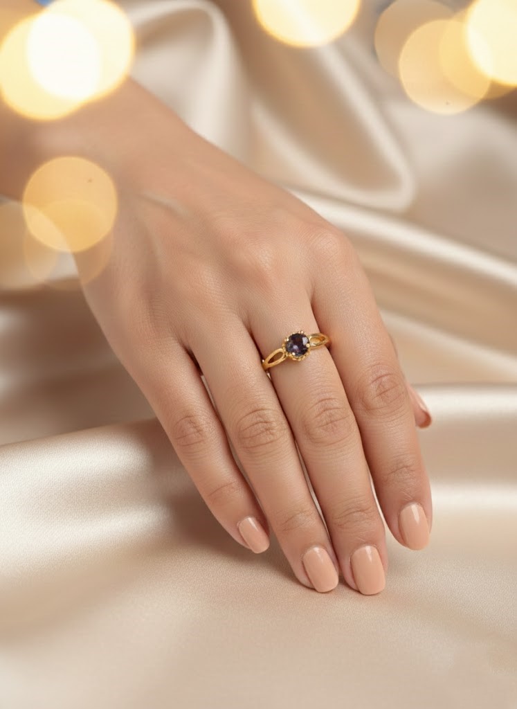Warm Yellow Gold Band: Crafted in a polished yellow gold setting, providing a traditional and rich contrast to the deep purple of the stone.