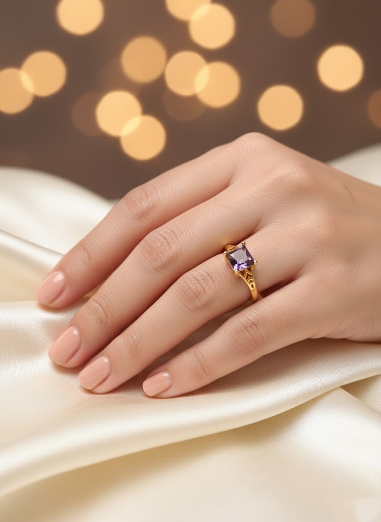 Vibrant Princess-Cut Gemstone: Features a bold, square-cut purple stone (likely Amethyst) known for its deep color saturation and classic faceting.