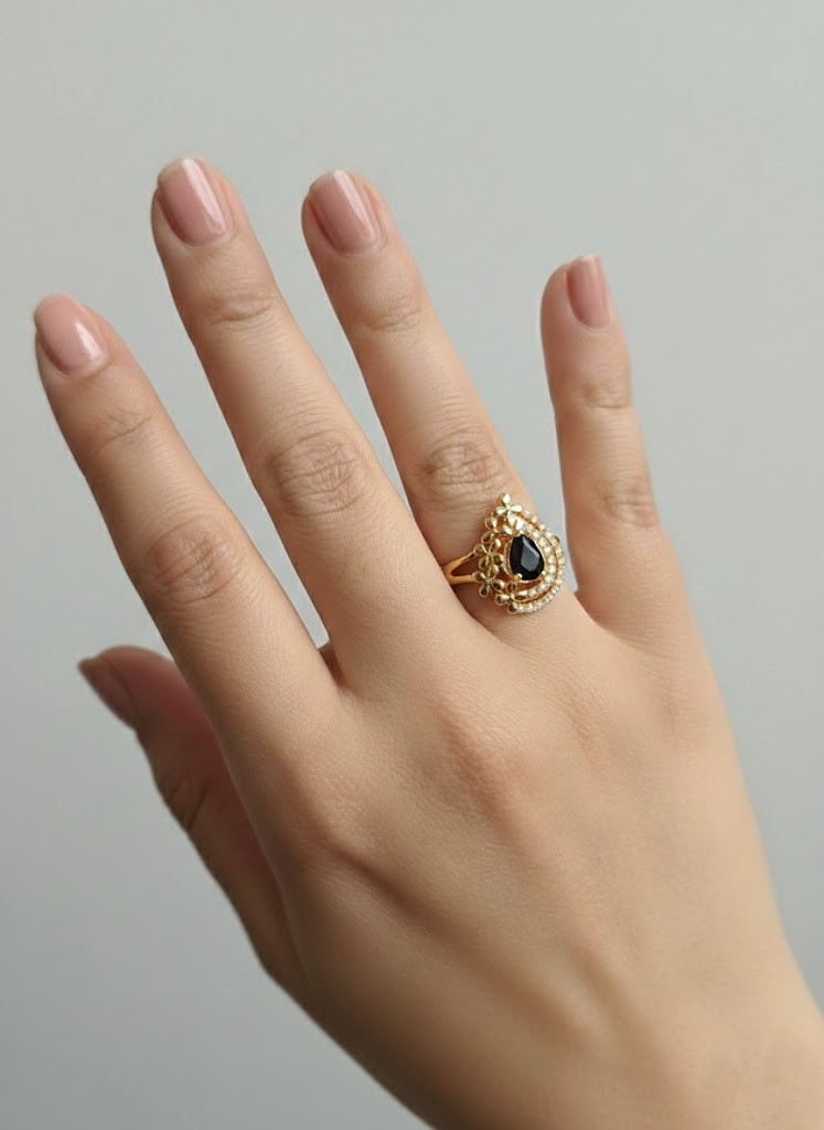 Embrace timeless allure with the captivating Midnight Blossom Tear Ring. This elegant gold ring features a striking pear-shaped black gemstone (such as black onyx or black spinel) as its mysterious and alluring centerpiece. The deep black teardrop gem is artfully complemented by a cluster of delicate gold floral motifs on one side and a sweeping curve of sparkling white cubic zirconia stones on the other. The lustrous gold setting beautifully enhances the gem’s dark brilliance and the surrounding sparkle. This ring is a harmonious blend of nature-inspired artistry and sophisticated glamour, perfect for those who desire a unique statement piece that embodies a blend of elegant drama and intricate design.