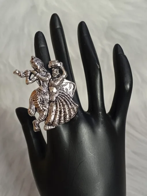 Celebrate the eternal bond of divine love with the captivating Yugal Divine Love Ring. This powerful statement ring features an exquisite, oversized oxidized silver casting of Lord Krishna and Radha, captured mid-dance with the flute. The intricate detail of their traditional attire, flowing garments, and serene expressions brings this spiritual art to life. Crafted in a rich, antique silver tone, this ring beautifully merges religious reverence with bold ethnic jewelry design. Worn prominently on the hand, it is a magnificent piece for festivals, cultural events, or as a soulful reminder of everlasting devotion.