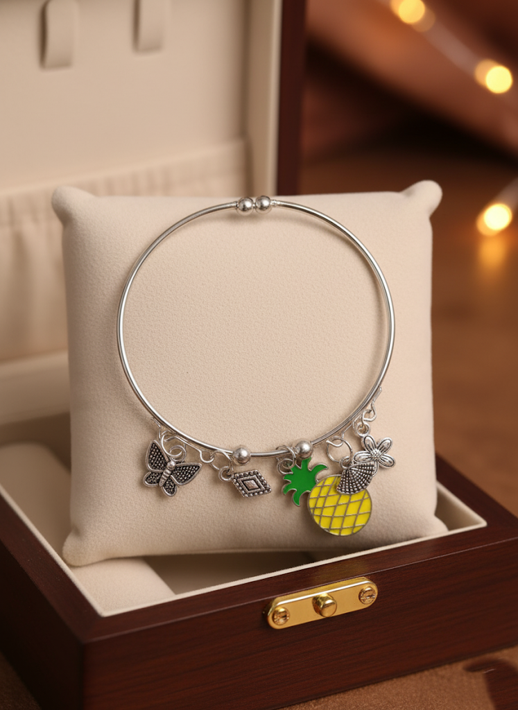 - Whimsical Charm Assortment: Includes a total of five charms: the pineapple, a butterfly, a flower, and two geometric/accent charms, all in silver-tone.