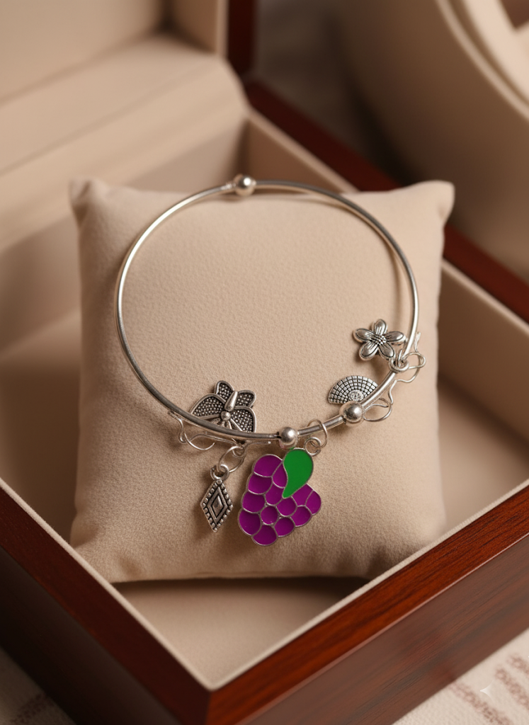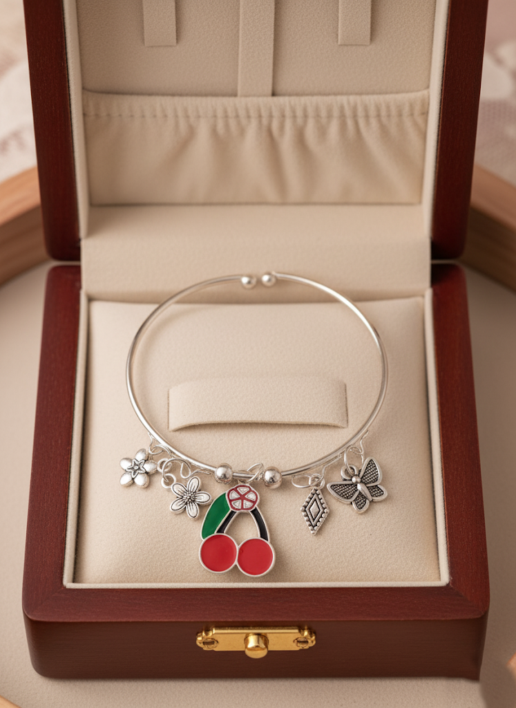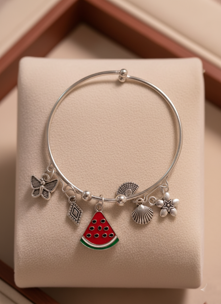 This fun and summery charm bangle bracelet is the perfect accessory for a tropical vibe or casual wear. It features a bright silver-tone hoop with five lively charms. The focal charm is a cheerful, enameled fruits, complemented by a delicate butterfly, a small flower, a stylized rhombus/diamond, and another small accent charm. All metal components are silver-tone. This piece is beautifully presented on a plush cushion within a dark wood gift box, making it an excellent gift for any occasion.