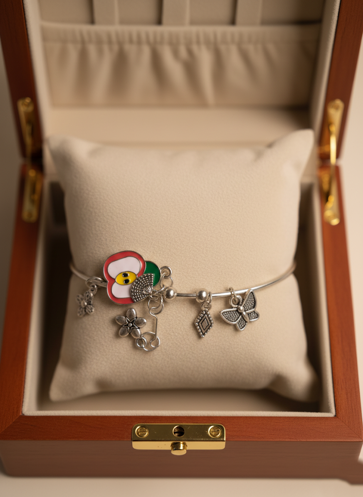 - Gift-Ready Packaging: The bracelet is displayed inside a handsome dark wooden box with a light beige velvet cushion.